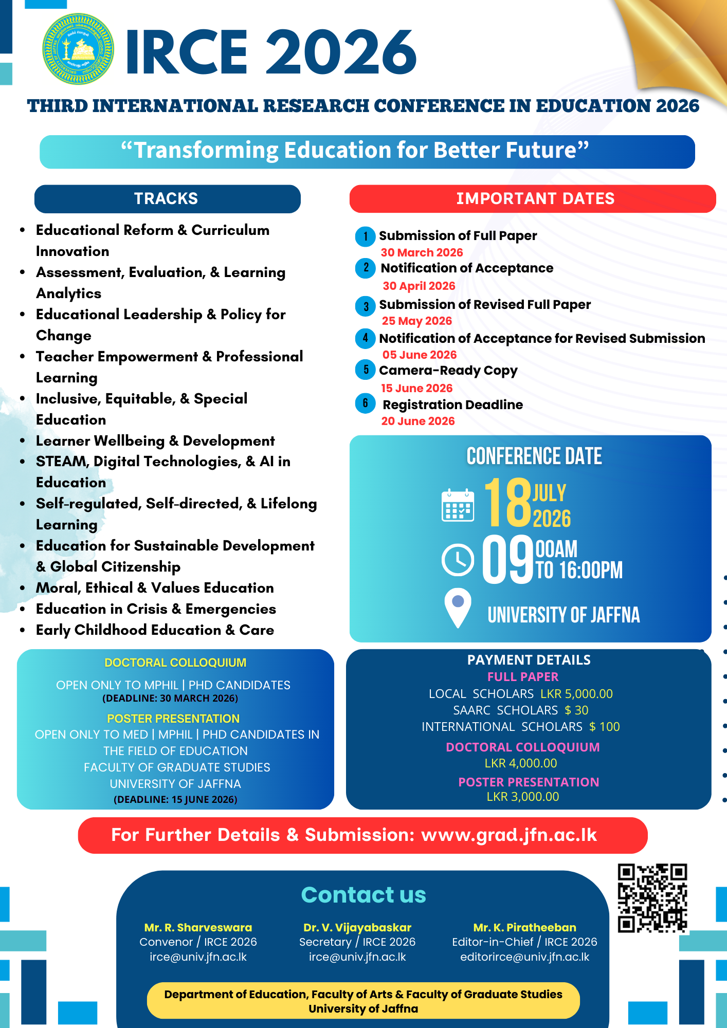 - Editorial Screening Committee Prof. A. Nithlavarnan, Professor in Education, Department of Education, Faculty of Arts, University of Jaffna Dr. V. Vijayabaskar, Senior Lecturer, Department of Education, Faculty of Arts, University of Jaffna Mr. R. Rajeskanna, Senior Lecturer, Department of Sociology, Faculty of Arts, University of Jaffna Mr. S. Sivakanthan, Senior Lecturer, Department of Sociology, Faculty of Arts, University of Jaffna Mr. K. Sajanthan, Assistant Librarian, University of Jaffna Mr. K. Piratheeban, Editor-in-Chief, IRCE-2026 Miss K. Goshalagini, Associate Editor, IRCE-2026